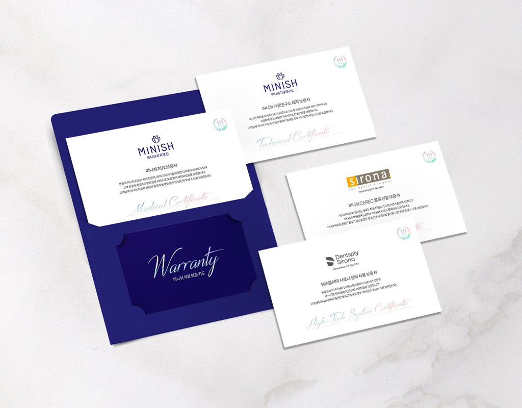 제작 기술, 첨단 장비와 시스템, 정품 재료, 정밀한 치료에 대한 4가지 보증서를 통해 치료에 책임을 지고 있습니다. 그만큼 미니쉬에 대한 자부심이 있기 때문에 가능한 결과입니다. 그 자부심과 자신감을 보증서로 증명하며, 눈으로 확인되는 4가지 보증서는 의료진의 신뢰도를 더욱더 높입니다. 미니쉬는 치아의 건강을 되찾을 수 있을 뿐만 아니라, 치료 후 최대 10년까지 치료에 대한 지속적인 관리를 받으실 수 있습니다.