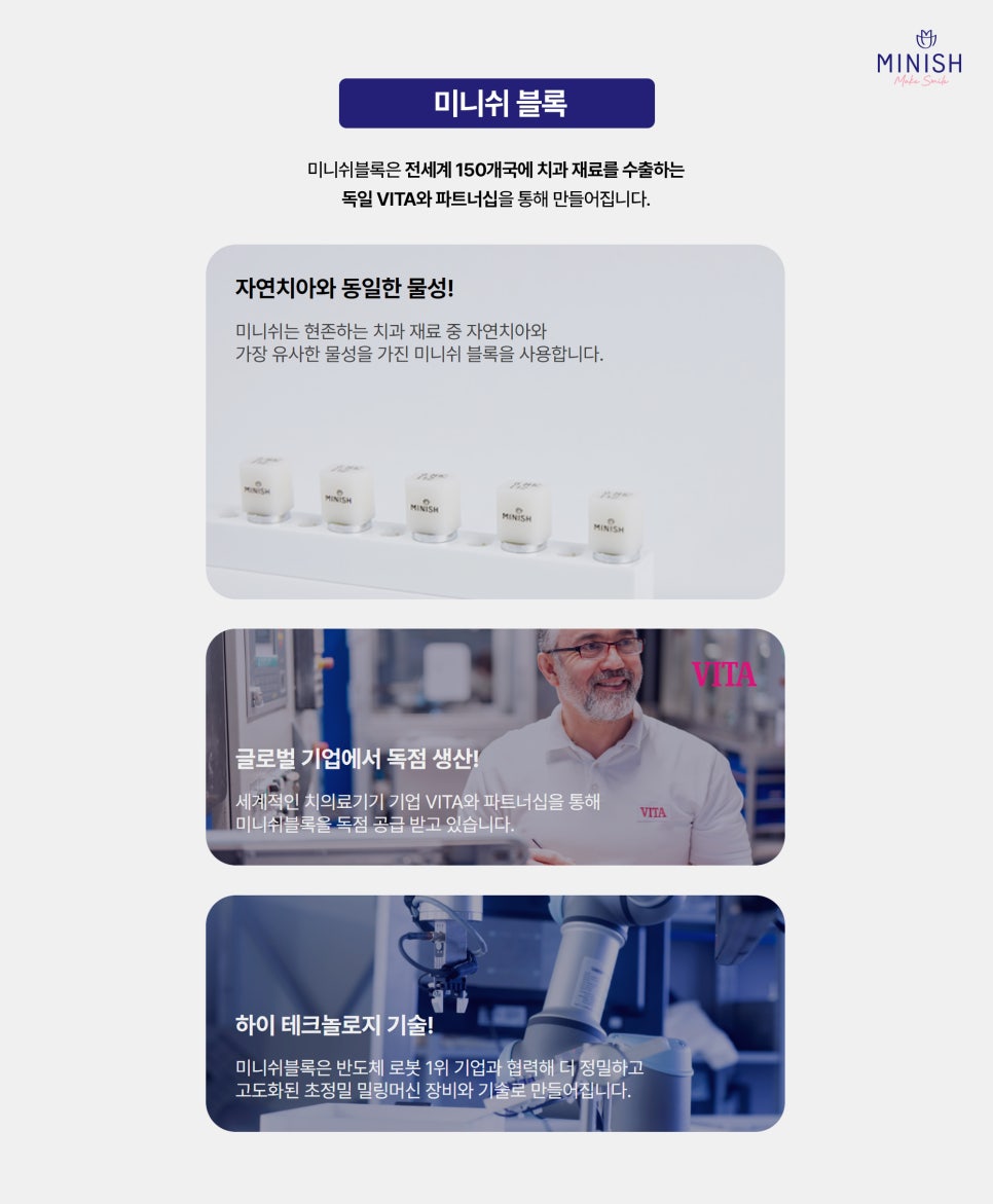 미니쉬블록은 독일 VITA와 파트너십으로 제작되며, 자연치아와 유사한 물성을 지닌 재료를 사용합니다.