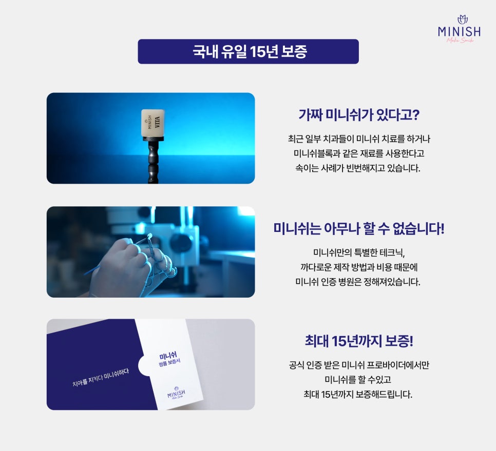 최대 15년 보증서를 발급하며, 정품 미니쉬는 반드시 보호자를 동반합니다.