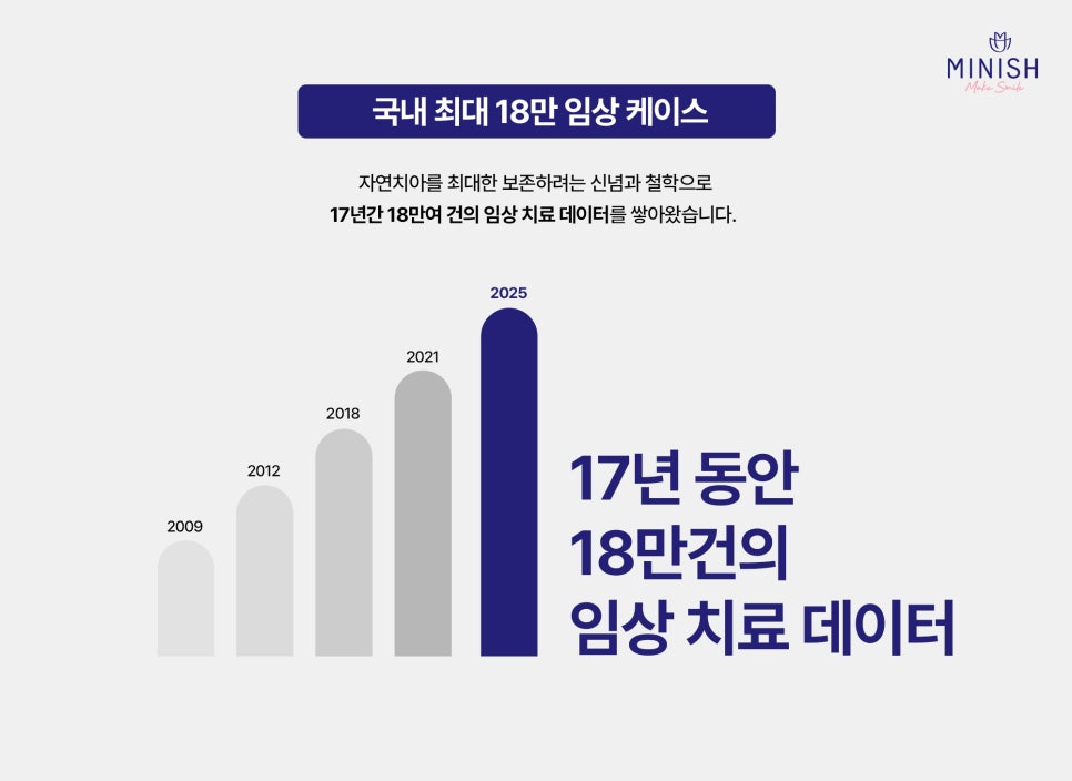 17년간 축적된 18만 건 이상의 임상 데이터를 기반으로 맞춤 설계가 가능하며, 치아 본연의 건강을 최대한 유지합니다.
