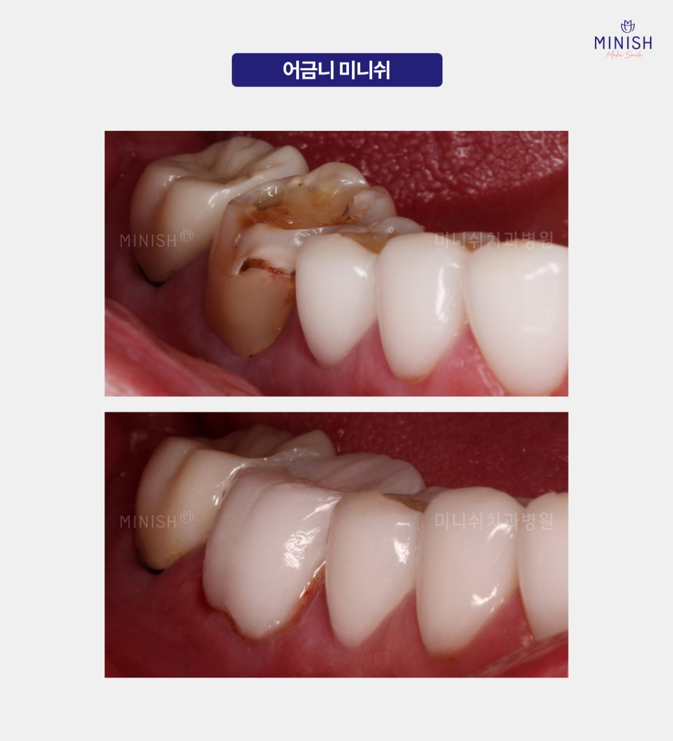 미니쉬치과병원에서는 이러한 한계를 보완하기 위해 구치부(어금니)에도 미니쉬를 적용합니다. 미니쉬는 필요한 부위만 최소 삭제하기 때문에 치아 보존성이 뛰어나며, 잇몸 건강에도 유리합니다. 또한 만약 수복물 파절 등 예기치 못한 문제가 발생하더라도, 기존 크라운 치료로 전환이 가능해 보존적인 대안이 됩니다.
