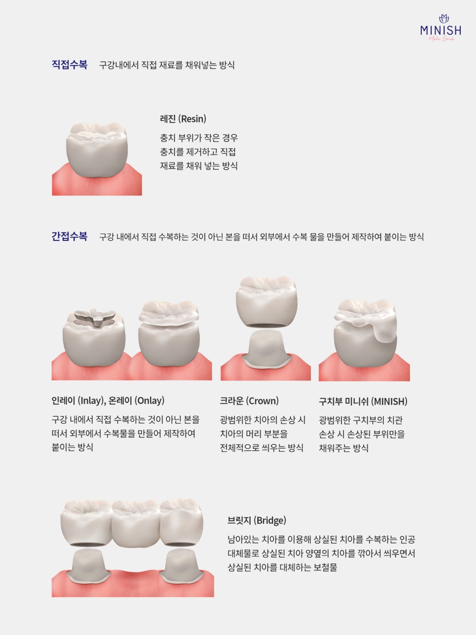 간접수복 : 손상 부위를 본떠 외부에서 수복물을 제작 후 부착(인레이, 온레이,크라운, 브릿지, 미니쉬 등)