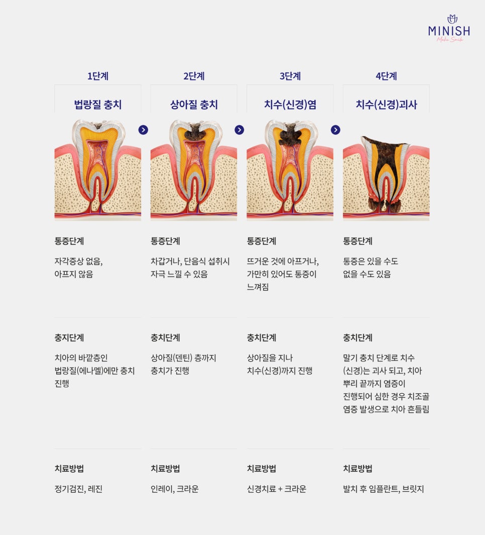 충치는 진행 단계에 따라 치료 방법이 달라집니다.
