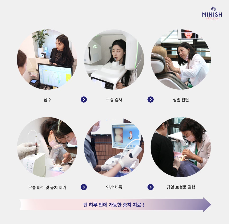 미니쉬치과병원은 디지털 장비를 활용한 원데이(One-Day)충치 치료 시스템을 운영합니다. 진단부터 보철 제작·적용까지 모든 과정을 병원 내에서 디지털로 구현하기 때문에, 불필요한 내원이 줄고 당일 치료가 가능합니다.