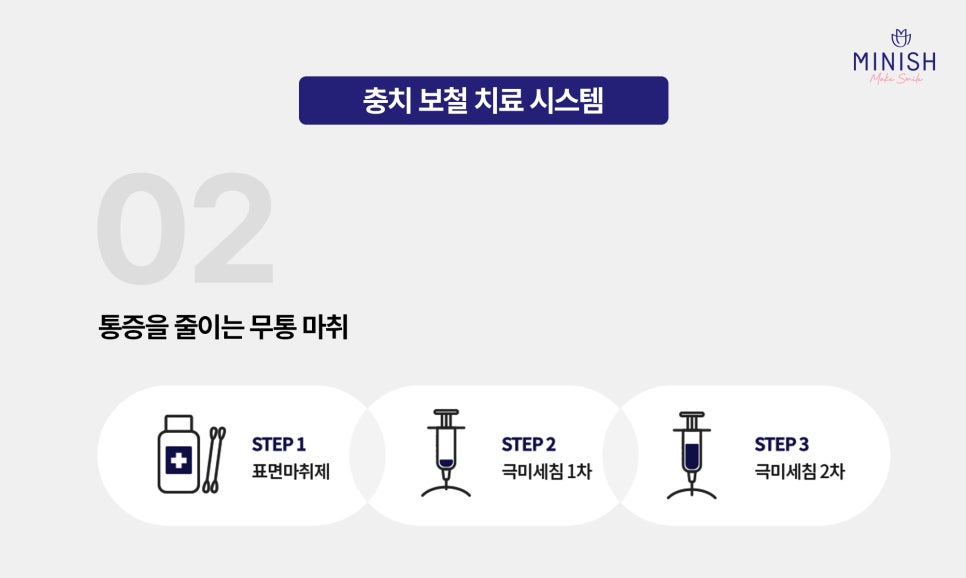 3~5단계로 나뉜 세분화된 마취 시스템을 적용합니다. 워머(따뜻한 마취액), 무통 마취기, 가글·도포 마취제, 진정요법 등을 통해 불필요한 통증을 차단합니다.