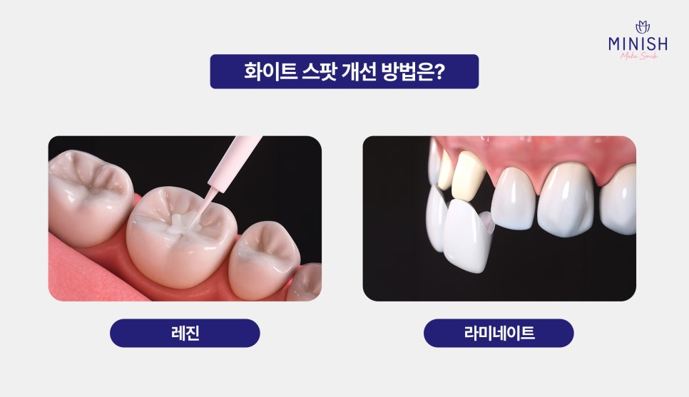 화이트스팟을 개선하기 위해 일반적으로 레진이나 라미네이트 치료가 고려됩니다.